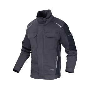 Ergonomiško dizaino darbinis švarkas Švarkas pagamintas iš Flex audinio, sudaryto iš 98% medvilnės ir 2% Spandex – tamprus, komfortabilus ir gerai kvėpuojantis audinys, užtikrinantis judėjimo laisvę ir patogumą. Apykaklė, pečių sritis, rankogaliai ir švarko apačia yra sustiprinti Canvas pynimo audiniu, kuris suteikia papildomą atsparumą dėvėjimui.