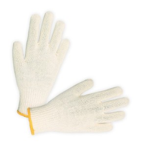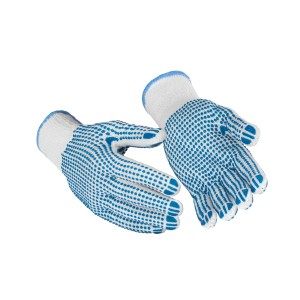 Pirštinės tankaus (7-to) mezgimo iš medvilnės ir poliesterio su PVC žirneliais iš vienos pusės. Rankogalis yra trikotažinis su apmegztu kanteliu. Pirštų galų padengimas PVC medžiaga yra platesnis, kas prailgina pirštinės tarnavimo laiką.
